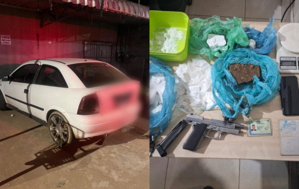 Ao entrarem em contato com o proprietário do veículo, os policiais perceberam forte odor de entorpecentes vindo da residência. Com autorização, foi realizada busca no local, onde foram apreendidos cerca de 388 gramas de substância semelhante a oxi, 395 gramas de cocaína, 177 papelotes da droga, duas balanças de precisão, além de uma pistola calibre .380 com 11 munições.