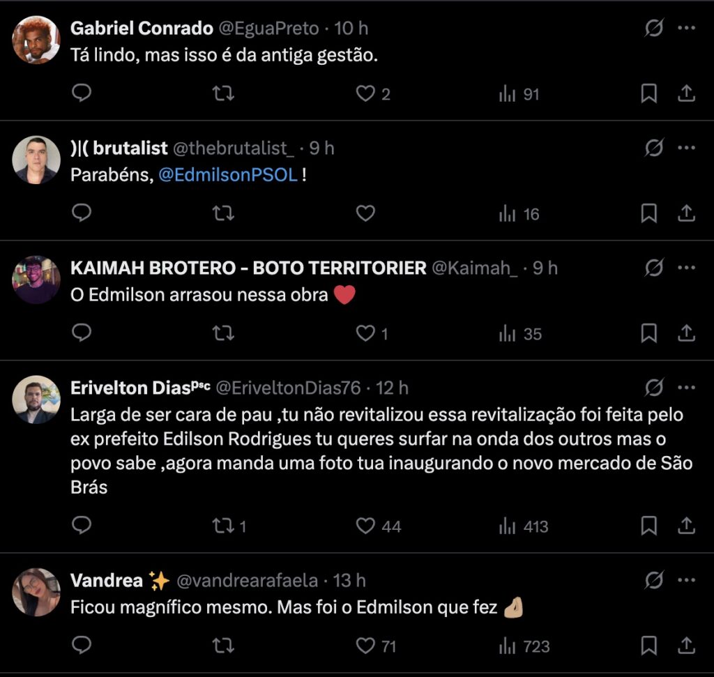 Nos comentários, usuários do X acusaram o prefeito de tentar se apropriar de uma obra iniciada na gestão anterior, comandada por Edmilson Rodrigues (PSOL).