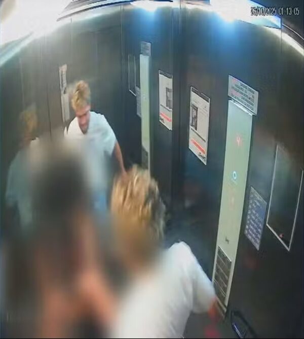 Nas câmeras do elevador, o conteúdo é ainda mais explícito: o turista desfere mais de 20 golpes, entre socos, tapas e joelhadas, sempre mirando a cabeça, o rosto e a barriga da mulher. A vítima tenta conter o ataque, pede para que ele pare e chega a ficar imóvel em um canto, tentando proteger o rosto. O agressor interrompe por alguns segundos, vira-se para a porta e volta a atacá-la, desta vez com mais força.