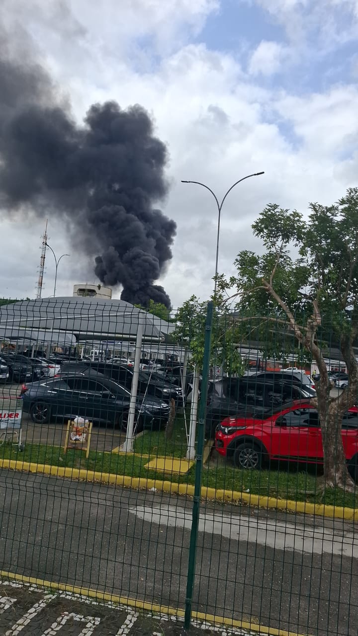 Um incêndio foi registrado no Aeroporto Internacional de Belém na manhã desta segunda-feira, 10. Nas imagens, é possível ver a fumaça em uma área anexa ao local, próximo ao estacionamento.