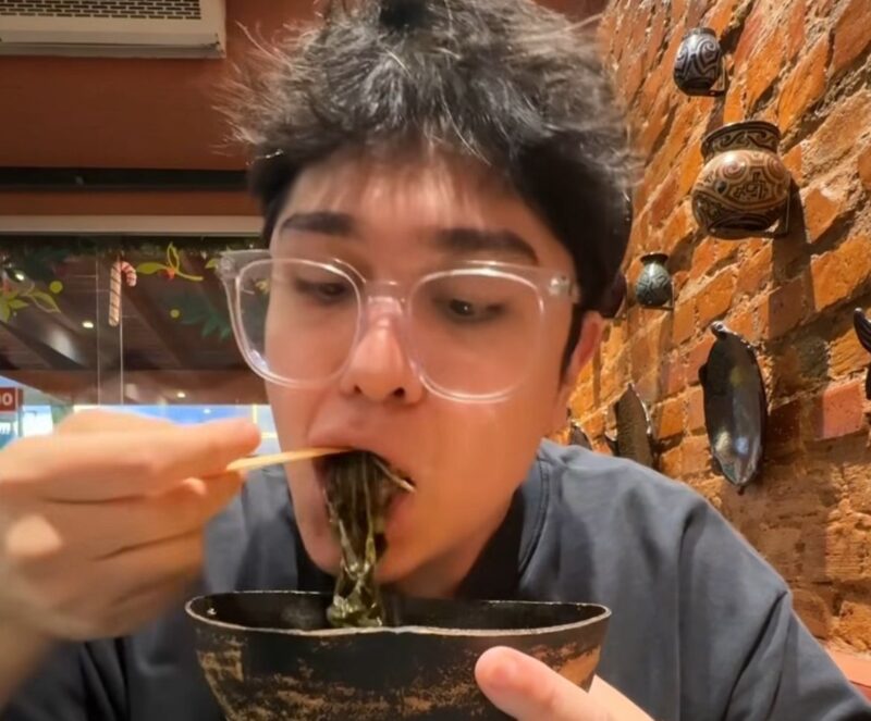Na gravação, Haru inicia pela maniçoba, prato típico preparado com folhas de mandioca. Ele comparou o sabor ao da feijoada, mas ressaltou as particularidades da receita paraense. “É gostoso. É uma vibe. Tem um fundo meio azedinho que a feijoada não tem, mas esse é o diferencial”, avaliou. O influenciador deu nota 10 para o prato.