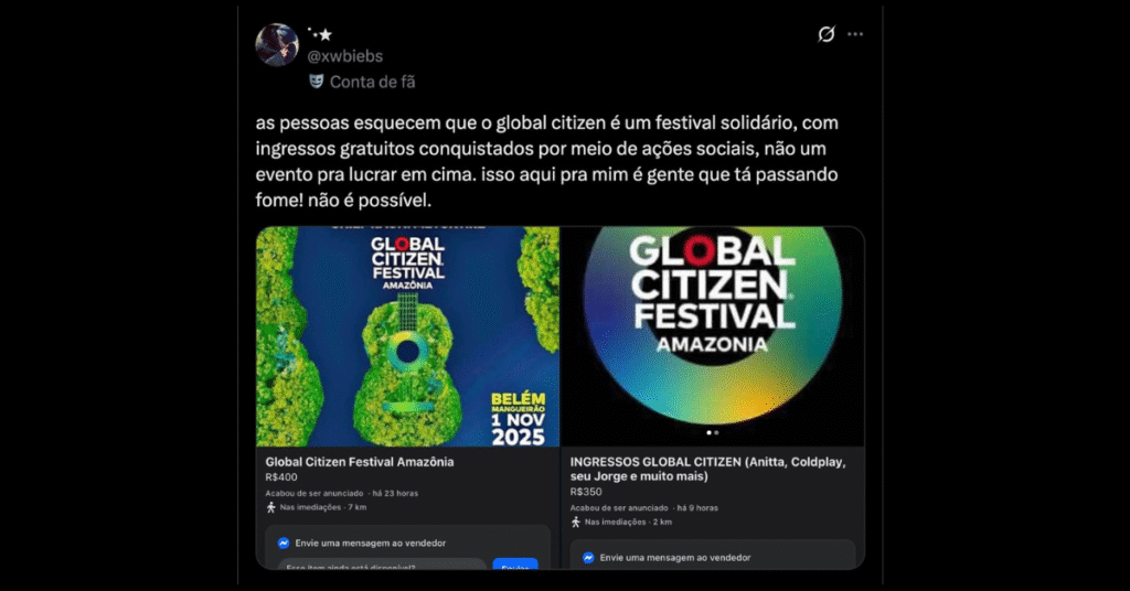 Nas redes sociais, internautas denunciaram a prática e alertaram sobre o risco de golpes. “As pessoas esquecem que o Global Citizen é um festival solidário, com ingressos gratuitos conquistados por meio de ações sociais, não um evento pra lucrar em cima. Isso aqui pra mim é gente que tá passando fome! Não é possível”, disse um usuário.