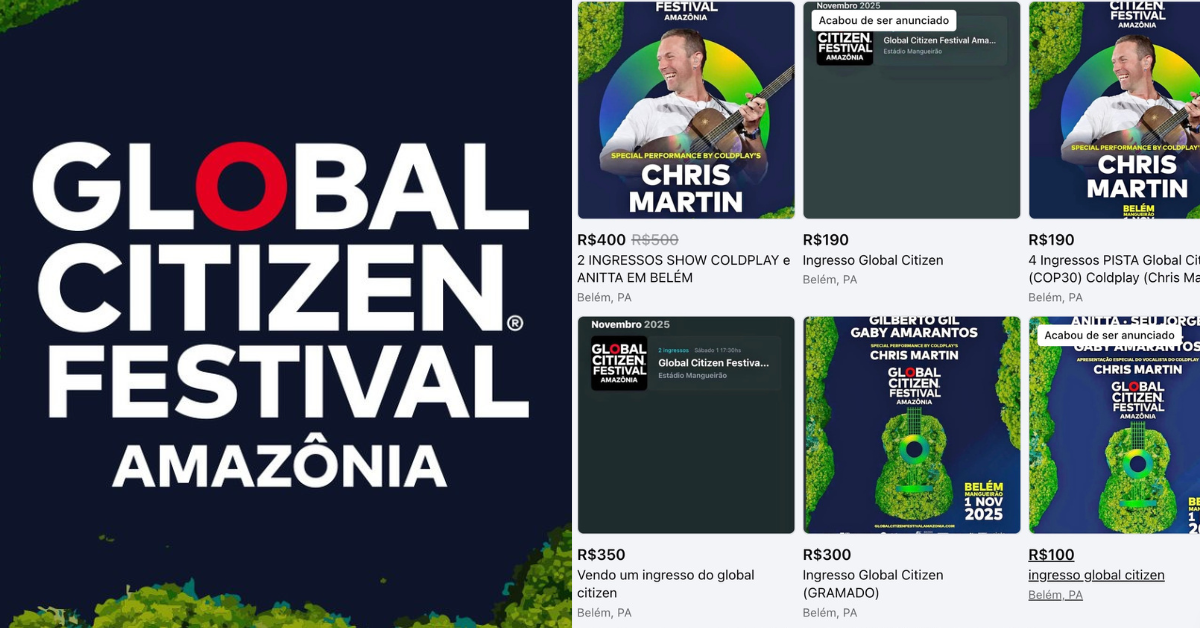 Os ingressos para o Global Citizen Festival Amazônia, que acontece no dia 1º de novembro, no Estádio do Mangueirão, em Belém, estão sendo revendidos na internet por valores que chegam a R$ 1 mil, mesmo sendo distribuídos gratuitamente via sorteio.