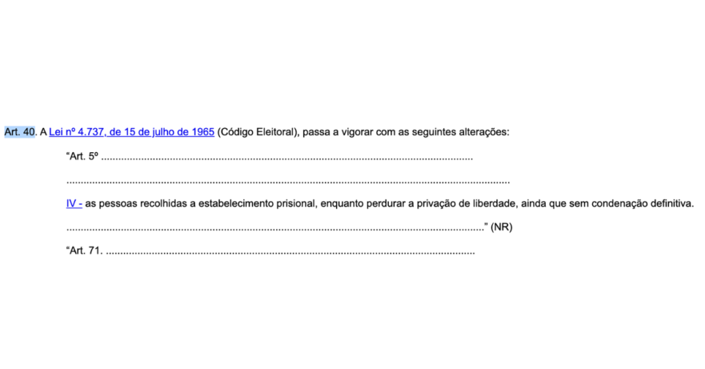 A medida está prevista no Art. 40 da nova legislação, que altera dispositivos do Código Eleitoral. O texto estabelece que pessoas recolhidas a estabelecimentos prisionais não poderão votar enquanto durar a privação de liberdade, ainda que sem condenação definitiva.