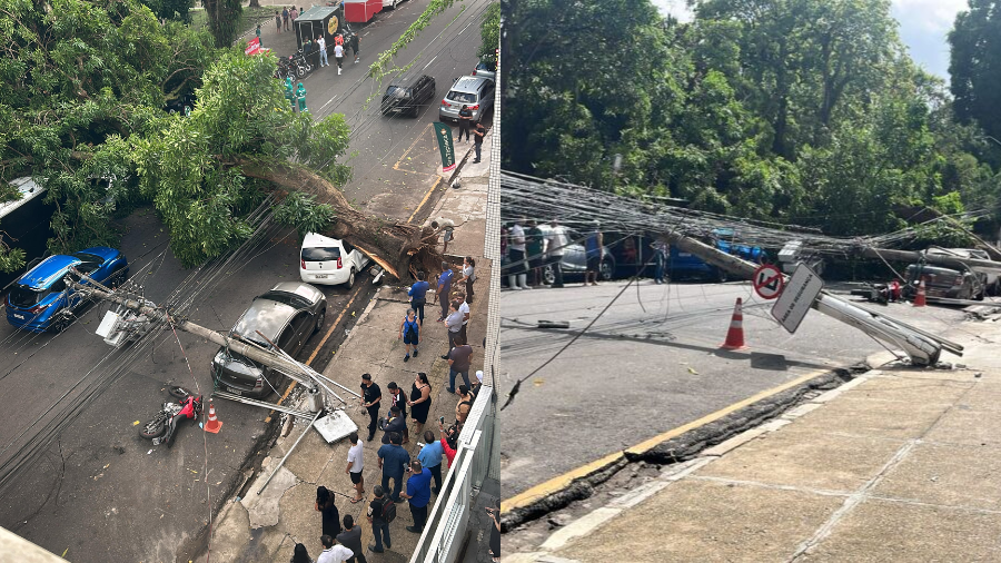 Uma mangueira centenária tombou na manhã desta quinta-feira (12), em frente ao prédio anexo do Tribunal Regional do Trabalho da 8ª Região (TRT-8), na rua Dom Pedro I, em Belém, provocando a queda de quatro postes de energia elétrica. O incidente deixou 99 clientes sem fornecimento de energia, telefonia e internet na região. Equipes da Equatorial Pará, em parceria com órgãos municipais e o Corpo de Bombeiros, seguem trabalhando para restabelecer os serviços o mais rápido possível.