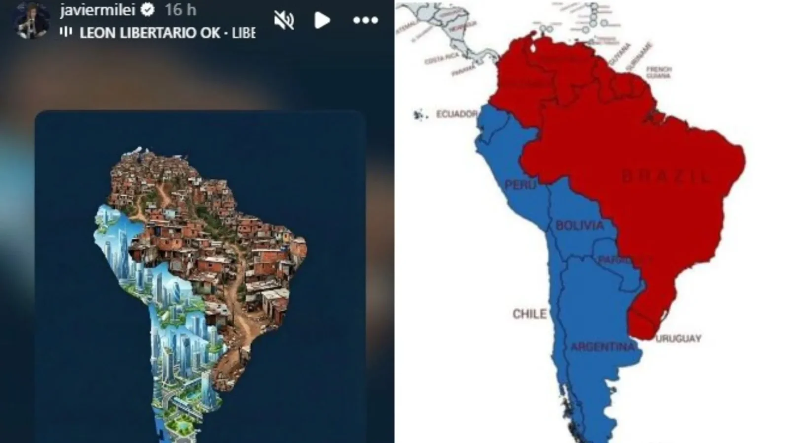 As publicações ocorreram após a vitória do candidato de direita José Antonio Kast nas eleições presidenciais do Chile, realizadas no domingo (14). Na imagem divulgada, a América do Sul aparece dividida em dois blocos. De um lado, Brasil, Uruguai, Venezuela, Guiana, Suriname, Guiana Francesa e Colômbia são representados como uma área degradada, com aparência de favela. Do outro, Argentina, Chile, Paraguai, Equador, Bolívia e Peru surgem retratados como uma região futurista e próspera.