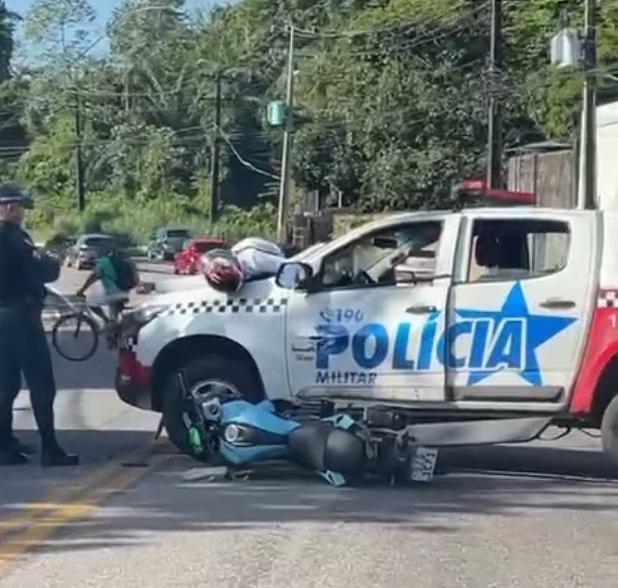 Um acidente envolvendo uma motocicleta e uma viatura da Polícia Militar do Pará foi registrado na manhã desta quarta-feira (9) na avenida Arthur Bernardes, em Belém. Segundo testemunhas, o motociclista bateu com força na lateral do veículo oficial e foi arremessado sobre o capô da viatura devido ao impacto.