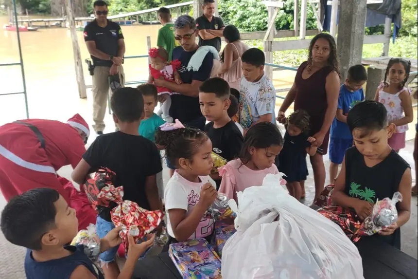 Crianças que vivem em comunidades ribeirinhas próximas ao distrito de Antônio Lemos, no Marajó, tiveram um Natal diferente, marcado por brincadeiras, presentes e a presença do Papai Noel.