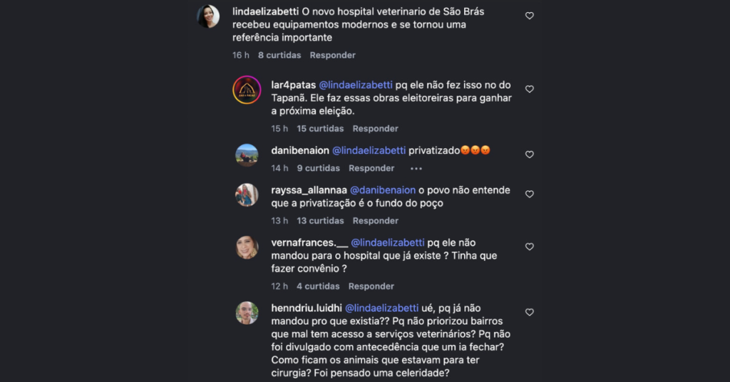 A vereadora afirma que a medida representa a terceirização de um serviço público essencial, transferindo a responsabilidade do atendimento veterinário a modelos privados sem ampla consulta popular ou discussão na Câmara Municipal. Segundo a parlamentar, a decisão prejudica famílias de baixa renda que dependiam do atendimento gratuito para urgências, consultas e procedimentos clínicos de seus animais.
