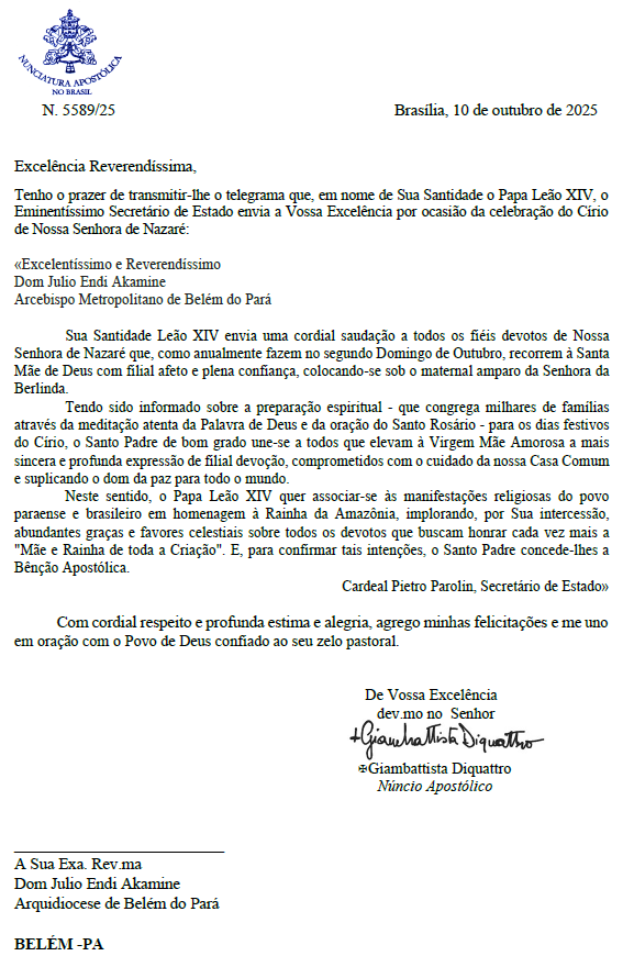 Para confirmar essas intenções, o Santo Padre concedeu a todos os participantes do Círio a Bênção Apostólica. A mensagem foi assinada pelo cardeal Pietro Parolin, secretário de Estado do Vaticano, e encaminhada ao arcebispo metropolitano de Belém, dom Julio Endi Akamine, pelo núncio apostólico Giambattista Diquattro.