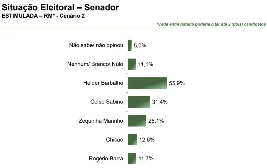 Em outro cenário testado pela pesquisa, Helder Barbalho amplia a vantagem e chega a 55,9% das intenções de voto. Na disputa pela segunda posição, Celso Sabino e Zequinha Marinho aparecem próximos, com 31,4% e 26,1%, respectivamente. Chicão Melo soma 12,6% e aparece em empate técnico com o deputado estadual Rogério Barra (PL), que registra 11,7%.