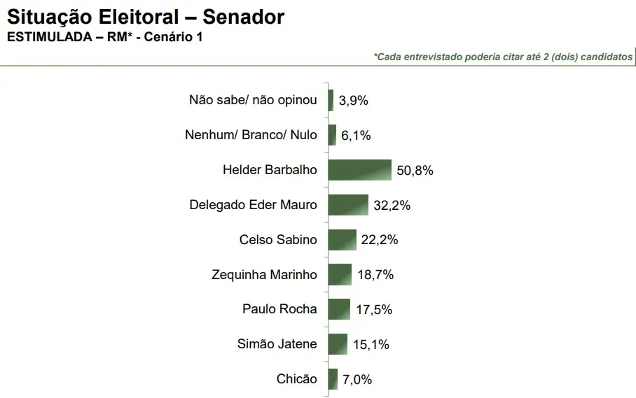 No cenário principal do levantamento, Helder Barbalho aparece na primeira colocação, com 50,8% das intenções de voto. Em seguida, surge o deputado federal Éder Mauro (PL), citado por 32,2% dos entrevistados. Nessa simulação, os eleitores puderam escolher até dois nomes entre os possíveis candidatos apresentados.