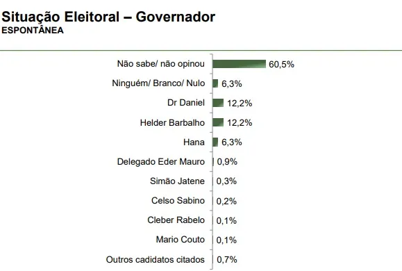 No cenário espontâneo, em que os entrevistados citam livremente seus candidatos, Dr. Daniel aparece com 12,2% das intenções de voto, tecnicamente empatado com o governador Helder Barbalho (MDB), que também registra 12,2%. O dado que chama atenção é o alto índice de indecisos: 60,5% dos entrevistados disseram não saber ou preferiram não responder.