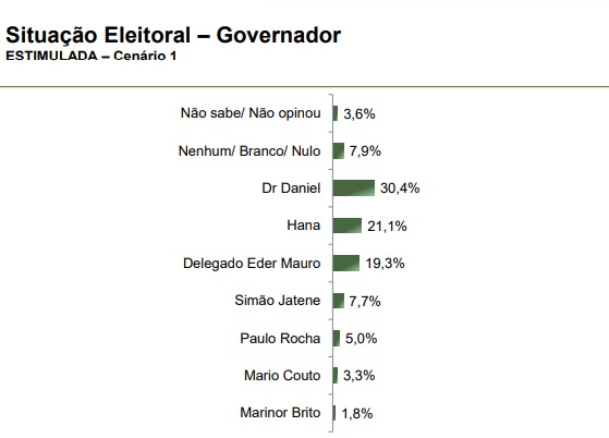 A pesquisa também simulou um eventual segundo turno entre Dr. Daniel e Hana Ghasan. Nesse cenário, o prefeito venceria com 49,1% das intenções de voto, contra 33,2% da vice-governadora. Brancos, nulos e indecisos somam 17,8%.
