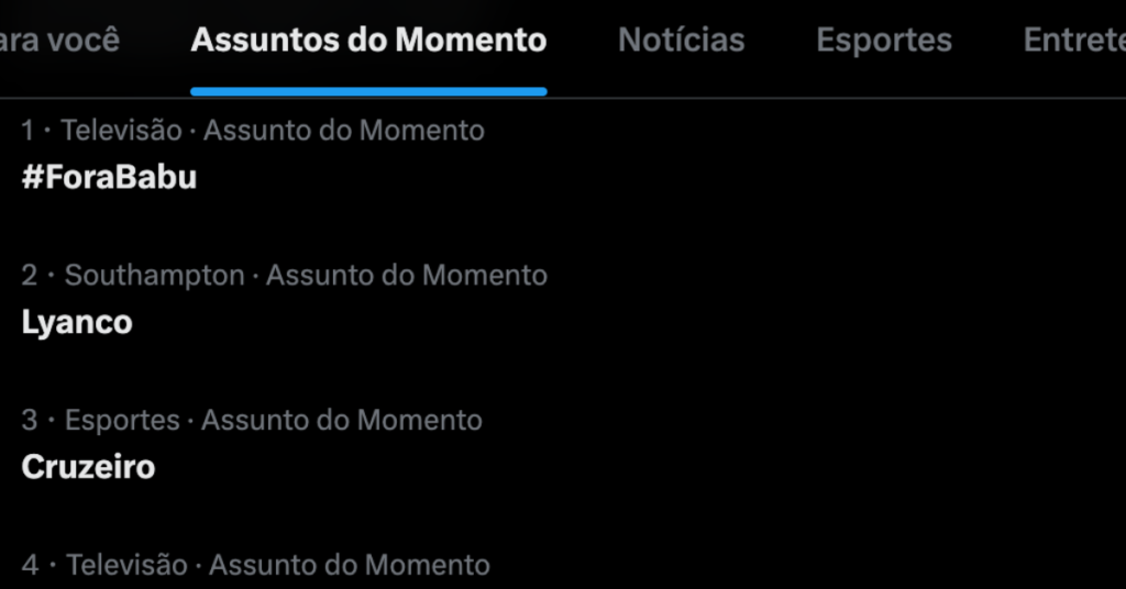 Logo após a formação da berlinda, a hashtag #ForaBabu chegou aos trending topics do X, antigo Twitter, e se tornou um dos assuntos mais comentados da plataforma. A movimentação mostra que o Paredão desta semana promete uma disputa intensa até o anúncio do resultado, marcado para a noite de terça feira (10).