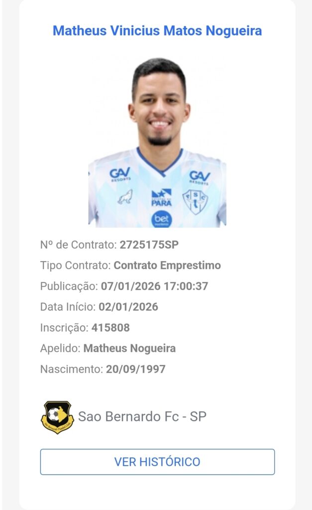 Nessa quarta-feira, 7, o contrato de empréstimo de Matheus Nogueira foi publicado no BID pelo São Bernardo. Com isso, a ida dele ao clube está confirmada. O goleiro tem contrato com o Paysandu até o final de 2027.