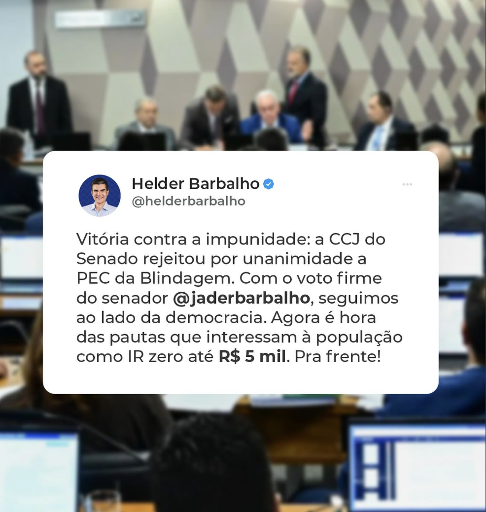 A proposta, aprovada na semana passada pela Câmara dos Deputados, ampliava a proteção a parlamentares na Justiça e foi alvo de protestos e pressões internas.“Vitória contra a impunidade: a CCJ do Senado rejeitou por unanimidade a PEC da Blindagem. Com o voto firme do senador Jader Barbalho, seguimos ao lado da democracia. Agora é hora das pautas que interessam à população, como IR zero até R$ 5 mil. Pra frente!”, escreveu Helder.