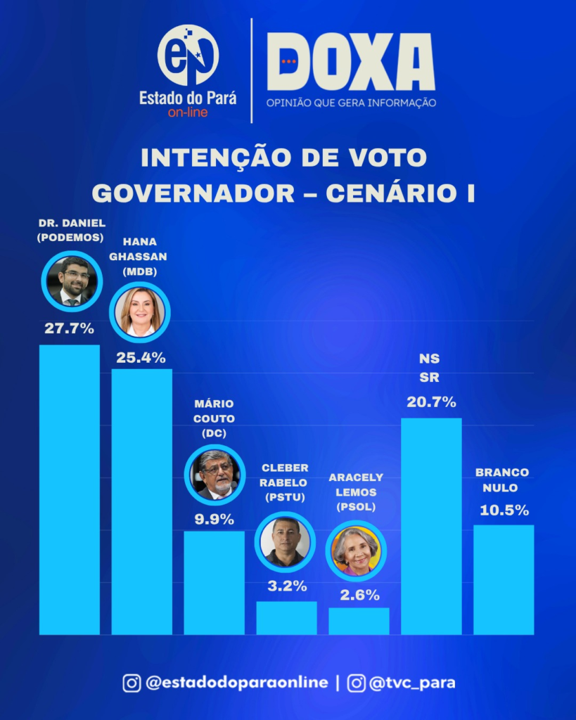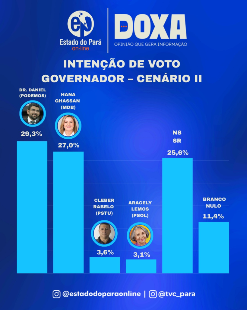 A pesquisa Doxa de abril mostra empate técnico entre Dr. Daniel (Podemos) e Hana Ghassan (MDB) na disputa pelo governo do Pará. No primeiro cenário estimulado, Dr. Daniel aparece com 27,7% das intenções de voto, enquanto Hana Ghassan tem 25,4%. No segundo, Daniel registra 29,3% e Hana soma 27%. Com margem de erro de 3,1 pontos percentuais, os dois ficam tecnicamente empatados nos cenários apresentados.