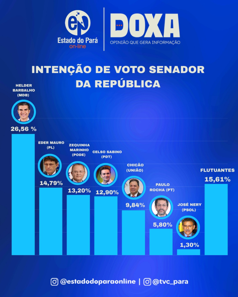 Na disputa pelo Senado, Helder Barbalho (MDB) lidera com 26,56%. Em seguida aparecem os flutuantes, com 15,61%, Eder Mauro (PL) com 14,79%, Zequinha Marinho (Podemos) com 13,2%, Celso Sabino (PDT) com 12,9%, Chicão (União) com 9,84%, Paulo Rocha com 5,8% e José Nery (PSOL) com 1,3%.