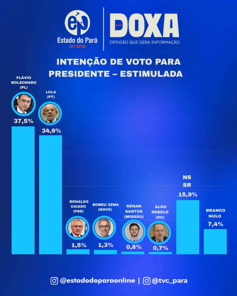 No cenário estimulado para presidente da República, Flávio Bolsonaro (PL) aparece com 37,5% no Pará, enquanto Lula (PT) tem 34,9%. Depois vêm Ronaldo Caiado (PSD), com 1,5%, Romeu Zema (Novo), com 1,3%, Renan Santos (Missão), com 0,8%, e Aldo Rebelo (DC), com 0,7%. Os votos em branco e nulo somam 7,4%, e 15,9% dos entrevistados disseram não saber ou não responderam.