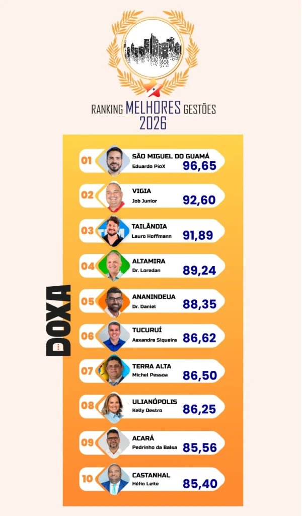 A pesquisa divulgada pela Doxa nesta quinta-feira (23) apresentou um ranking das gestões municipais mais bem avaliadas no Pará, com base na percepção da população sobre o desempenho dos prefeitos. O levantamento coloca São Miguel do Guamá na liderança, com índice de aprovação de 96,65% da gestão de Eduardo Pio X (MDB).