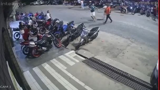 Câmeras de estabelecimentos próximos registraram o momento em que o investigador, usando camisa vermelha, é retirado da área logo após os disparos.