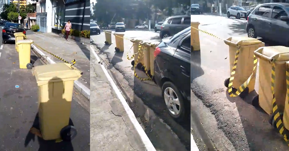 Em vídeo publicado nas redes sociais, é possível ver uma fila de lixeiras posicionadas de maneira a bloquear toda a faixa de estacionamento.