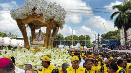 11h58: Nazinha chega à Praça Santuário e abençoa a milhares de fiéis que a aguardavam 11h53: Nossa Senhora de Nazaré passa pela Avenida Generalíssimo Dedoro nos minutos finais da procissão 11h20: A Imagem Peregrina segue pela Avenida Nazaré e já se aproxima do Largo do Redondo 10h50: Imagem Peregrina começa a entrar na Avenida Nazaré … Continue lendo Círio 2025 é concluído com missa na Praça Santuário