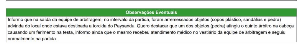 Quero destacar que um dos objetos (pedra) atingiu o quinto árbitro na cabeça causando um ferimento na testa, informo ainda que o mesmo recebeu atendimento médico no vestiário da equipe de arbitragem e seguiu normalmente na partida”, relatou em súmula.