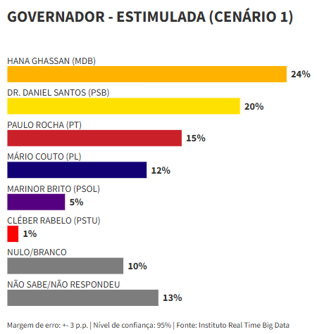 No primeiro cenário testado, Hana Ghassan aparece com 24% das intenções de voto, enquanto Daniel Santos registra 20%. Na sequência surgem o ex-senador Paulo Rocha (PT), com 15%, o ex-senador Mário Couto (PL), com 12%, a vereadora Marinor Brito (PSOL), com 5%, e Cléber Rabelo (PSTU), com 1%. Entre os entrevistados, 10% afirmaram que votariam em branco ou nulo, e 13% não souberam responder.