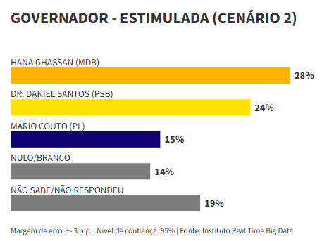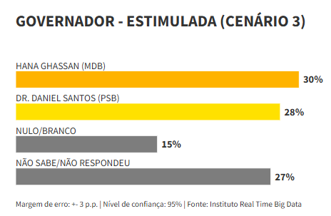 O terceiro e último cenário apresenta um confronto direto entre Ghassan e Daniel. A vice-governadora registra 30% das intenções de voto, contra 28% do prefeito. Neste recorte, 15% afirmam que votariam em branco ou nulo, e 27% não souberam responder.