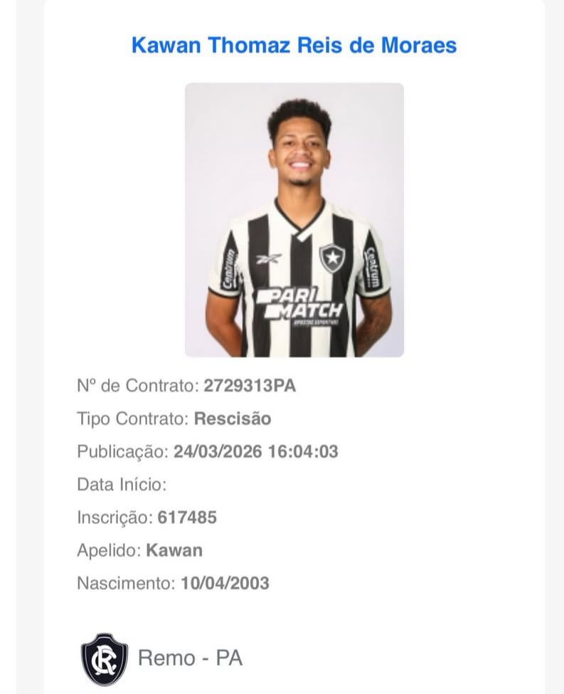 O Clube do Remo anunciou nesta terça-feira (24) a saída do zagueiro Kawan, que não faz mais parte do elenco azulino. O jogador, que estava no clube por empréstimo junto ao Botafogo-RJ, teve o contrato rescindido em comum acordo entre as partes.