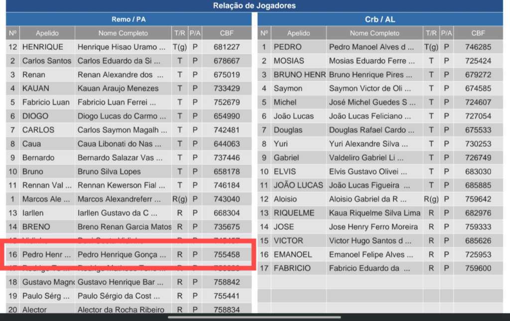 O nome do Leão Azul entrou na discussão após consulta aos registros oficiais da CBF. No sistema da entidade, Pedro Henrique Gonçalves da Silva aparece vinculado ao Remo em 2022, quando disputou a Copa do Brasil Sub-17.