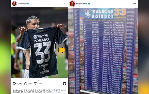 Após a derrota pelo placar de 3 a 2 para o Remo na última terça-feira (14), o Paysandu foi alfinetado pelo perfil oficial do Brasileirão Série B no Instagram. A postagem relembra o tabu de 33 jogos que o Papão ficou sem vencer do rival, fato celebrado até hoje entre a torcida azulina.