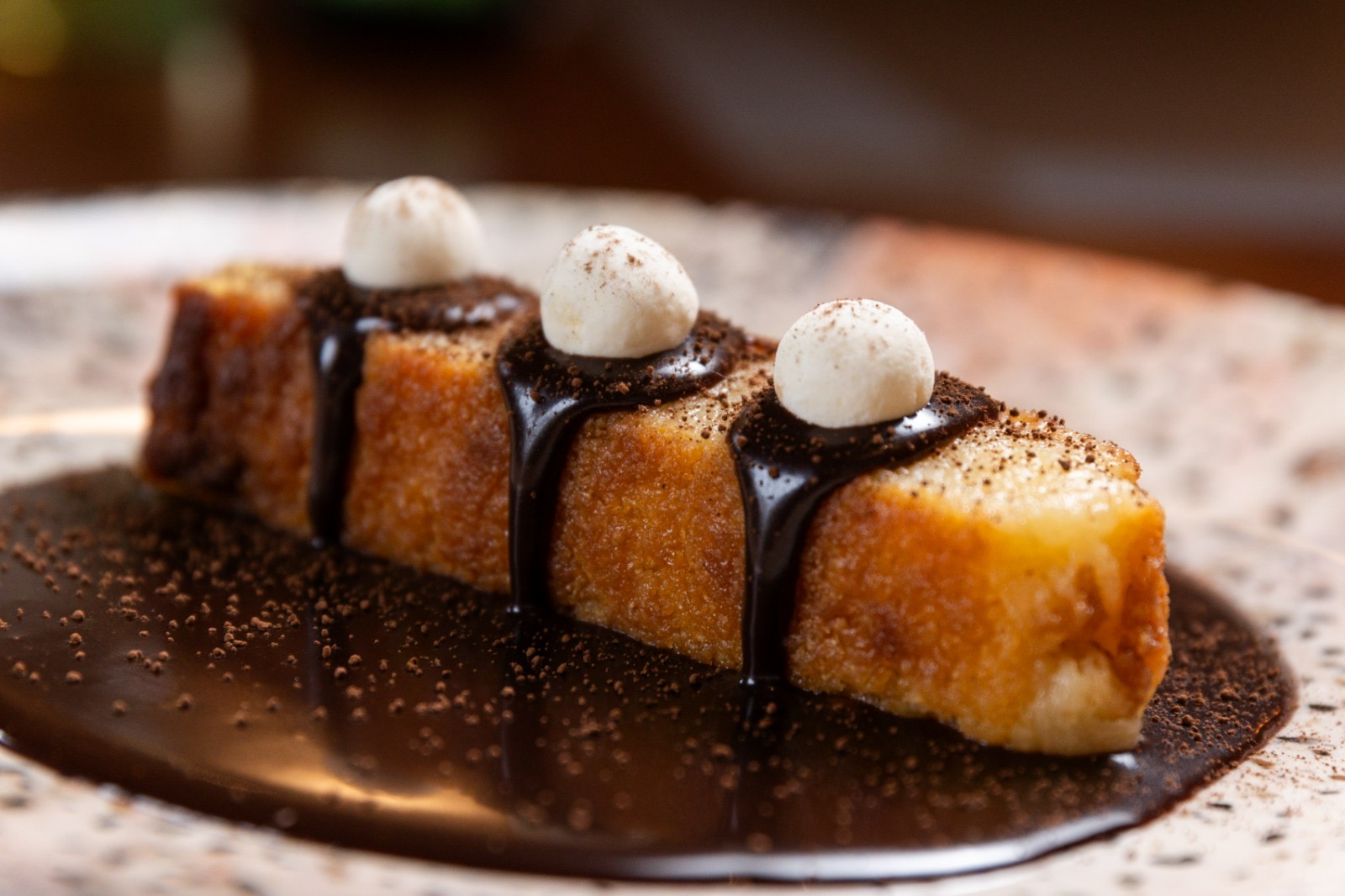 Para encerrar o almoço em grande estilo, no Brasileirinho, a pedida tem sido o delicioso bolo de macaxeira com calda de chocolate 50% do Combú e beijo de moça crocante é uma das preferidas do menu especial.