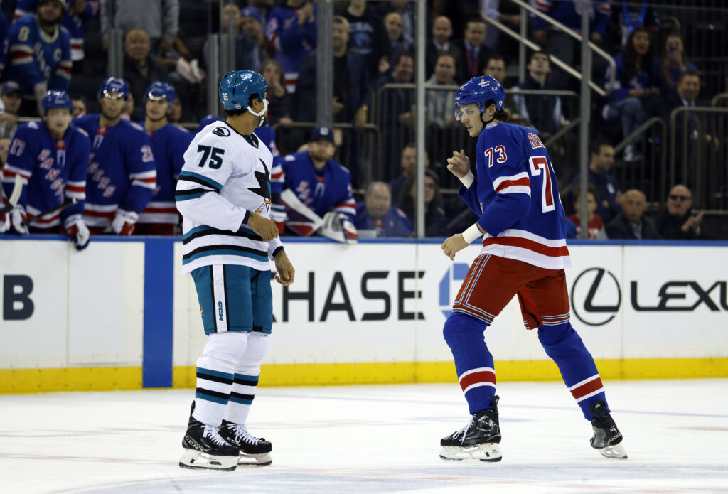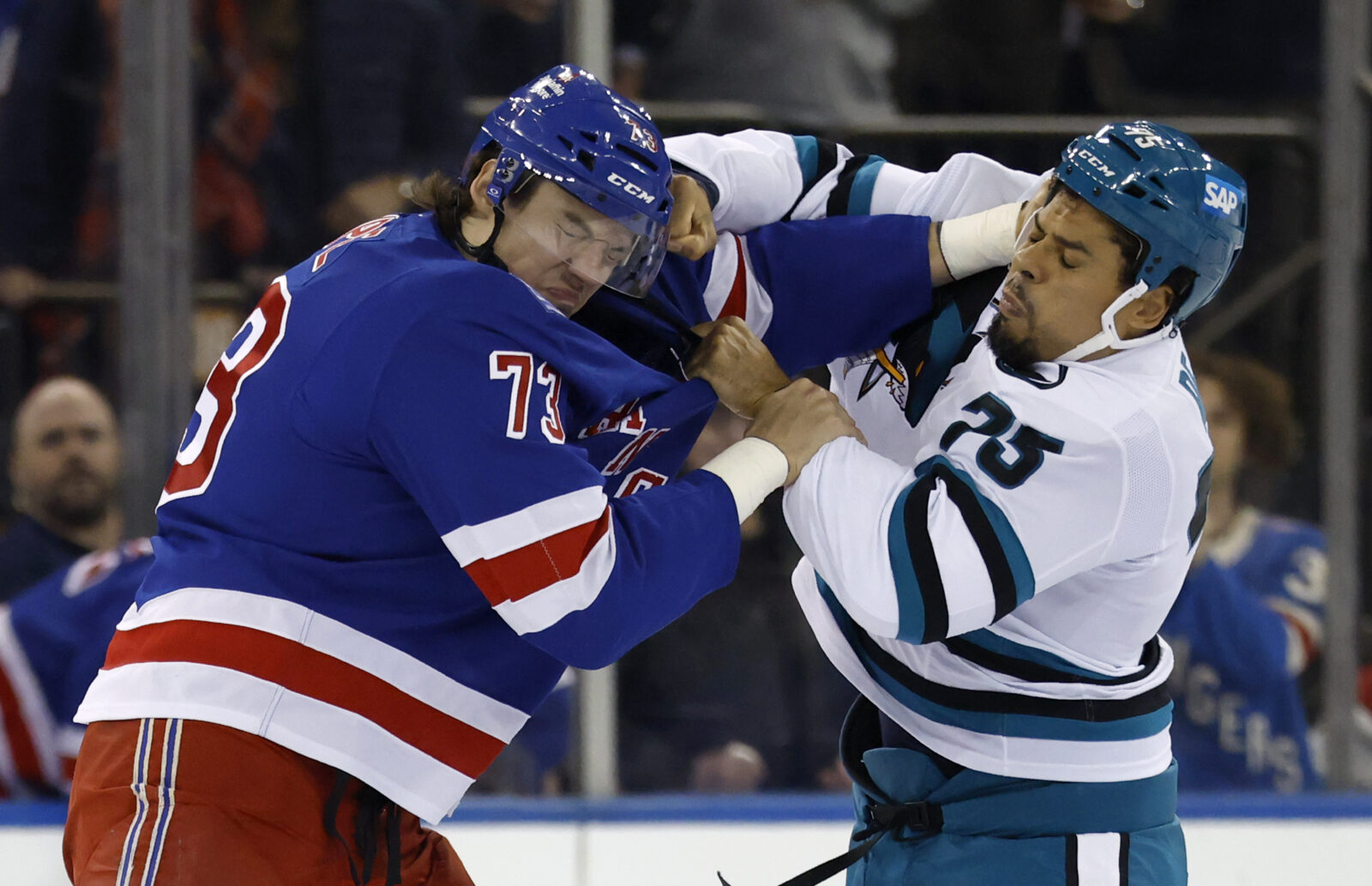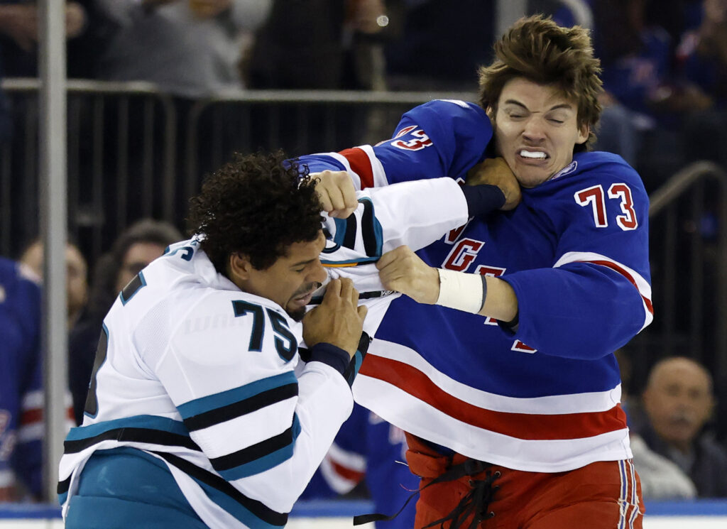 Um dos momentos mais aguardados por parte do público em partidas de hóquei no gelo não vem de um gol ou defesa espetacular. Às vezes, o que faz a arena vibrar é uma troca de socos. Foi o que aconteceu no duelo entre San Jose Sharks e New York Rangers, quando Ryan Reaves e Matt Rempe decidiram resolver no braço o que começou em empurrões.