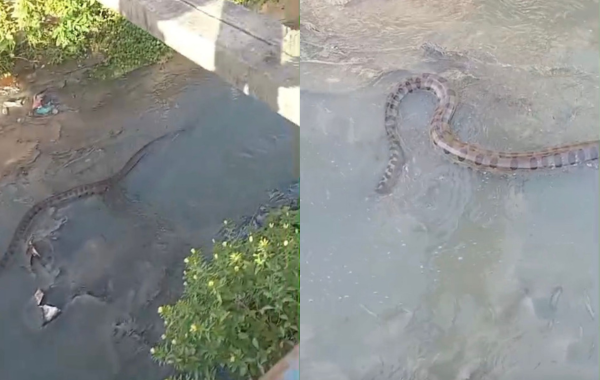 Em um vídeo, é possível ver o réptil submerso na água. O homem que registrou as imagens se mostrou impressionado com o que viu. “Olha o tamanho dessa ‘bicha’”, exclamou.