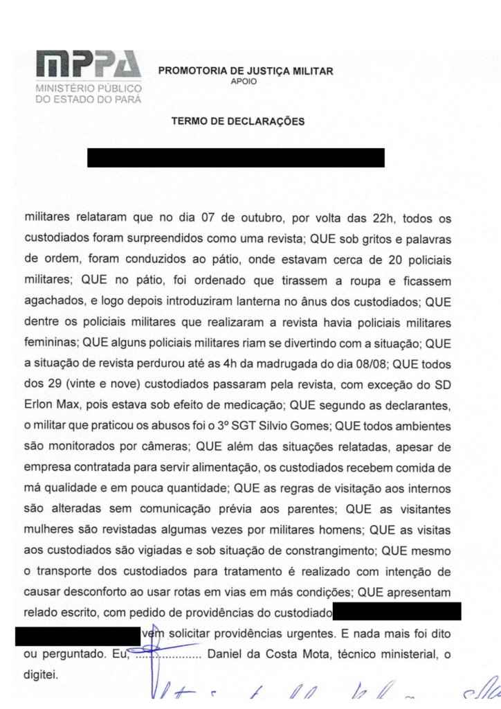 De acordo com o documento, policiais femininas também participaram da revista, e alguns agentes ririam da situação, configurando um cenário de humilhação e constrangimento. O local possui câmeras de segurança que, segundo os denunciantes, registraram todo o episódio.