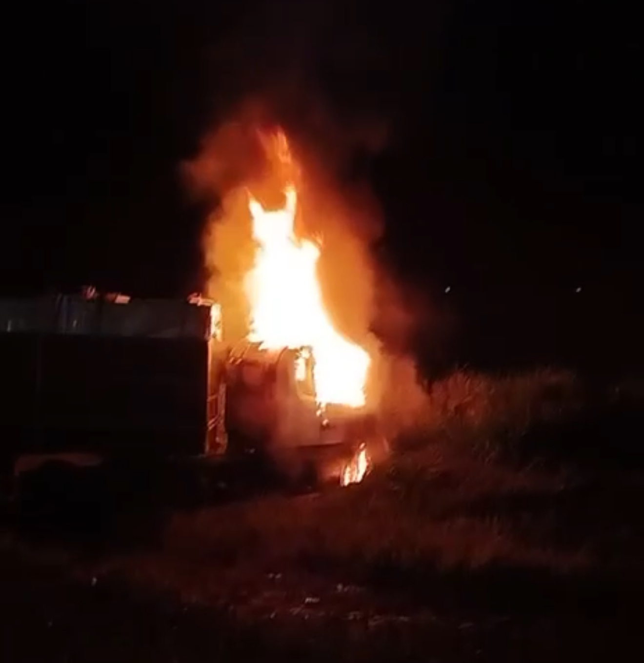 Ao tentar desviar do carro, o condutor perdeu o controle da direção, invadiu uma área de mata, onde o caminhão pegou fogo. Ele conseguiu sair às pressas com ferimentos leves.