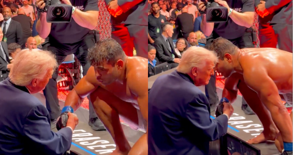 A interação aconteceu logo após o combate, quando Borrachinha se aproximou da grade para cumprimentar o presidente, que acompanhava o evento de perto. Durante o encontro, Trump destacou a aparência do brasileiro e afirmou que ele “poderia ser modelo” e que é “bonito demais para ser lutador”.