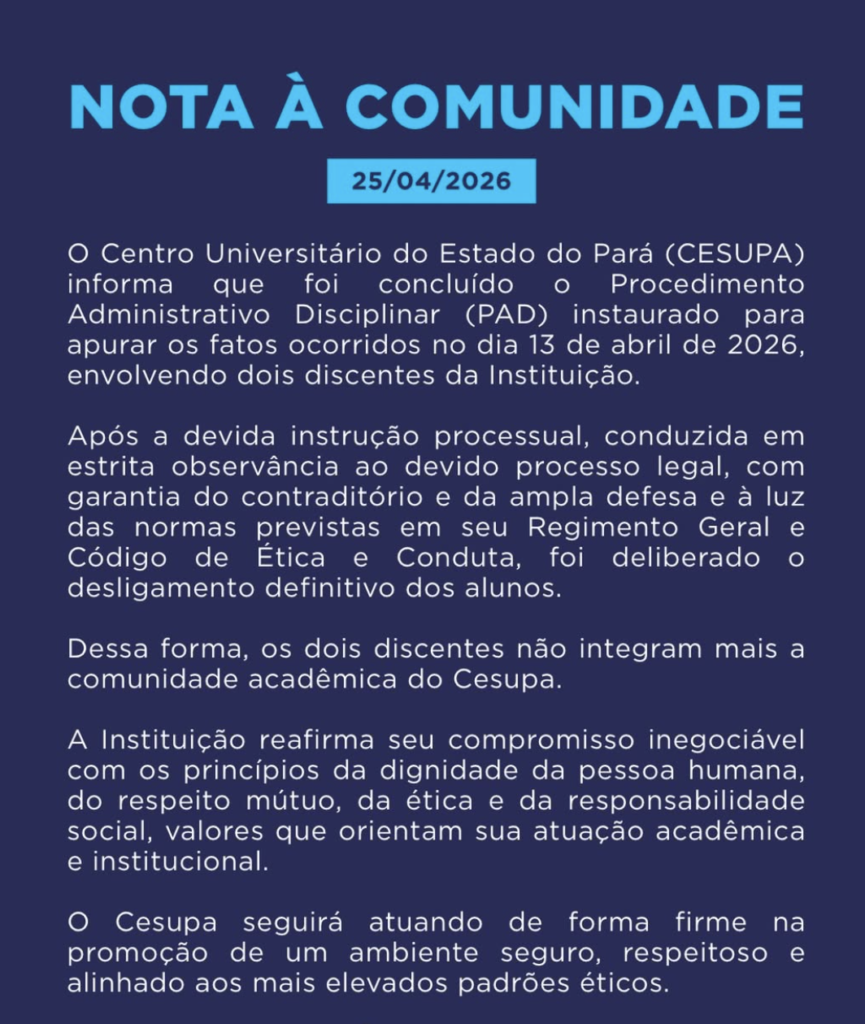 Em nota oficial, a instituição afirmou que a medida foi tomada após garantir o direito ao contraditório e à ampla defesa, conforme o Regimento Geral e o Código de Ética da universidade. “Os dois discentes não integram mais a comunidade acadêmica do Cesupa”, diz o comunicado.