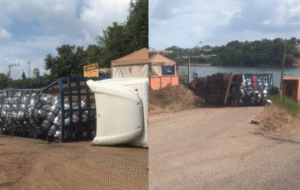 Vídeo: carreta carregada com botijões de gás tomba ao tentar embarcar em balsa em Belo Monte