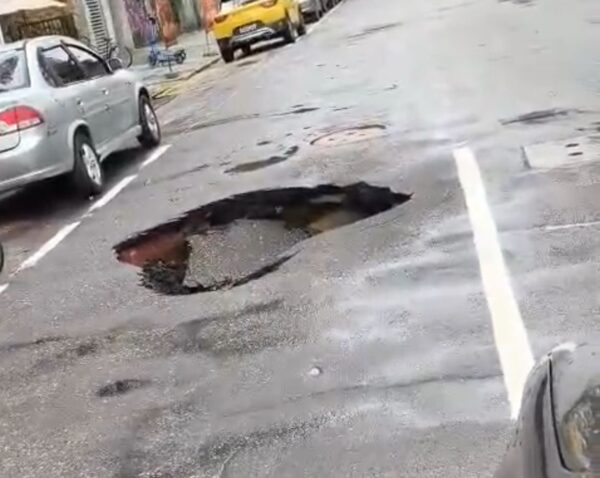 O problema foi registrado na tarde deste sábado, 21, nas proximidades da Sorveteria Cairú, ponto bastante conhecido e de intenso fluxo de veículos e pedestres. Imagens feitas no local mostram o afundamento do asfalto, com parte da via comprometida.