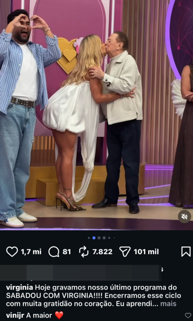“Hoje gravamos nosso último programa do SABADOU COM VIRGINIA!!!! Encerramos esse ciclo com muita gratidão no coração. Eu aprendi, evolui, sorri, conheci pessoas maravilhosas e sou eternamente grata ao SBT por ter realizado meu sonho de me tornar apresentadora!!! Obrigada a @danielabravanelbeyruti e toda diretoria por terem acreditado em mim, obrigada @lucasguedez @margareth_serrao por estarem ao meu lado em todos momentos, obrigada @joao_mesquita por ser o melhor diretor sempre, obrigada equipe do SABADOU, obrigada a toda audiência, obrigada obrigada obrigada a todos!!!! Já estou com saudade 🥲 isso não é um ADEUS, quem sabe um até logo 🤍 hoje foi mágico!!! Vivi muitas emoções no SABADOU e vou levar pra sempre no meu coração❤️🔥